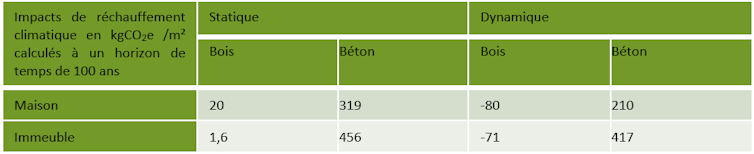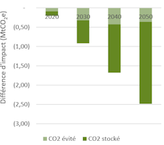 Ce décalage entraîne une augmentation des puits de carbone forestiers, du fait de la croissance de nouveaux arbres en remplacement, mais également d’une diminution de l’impact de réchauffement climatique cumulé, calculé pour mesurer l’effet des émissions de gaz à effet de serre en kgCO2-équivalent (kgCO2e). Car l’impact cumulé tient compte de l’effet annuel d’une émission jusqu’à un horizon temporel, défini à 100 ans par le GIEC. Le décalage des émissions jouant donc directement sur le cumul d’impact.